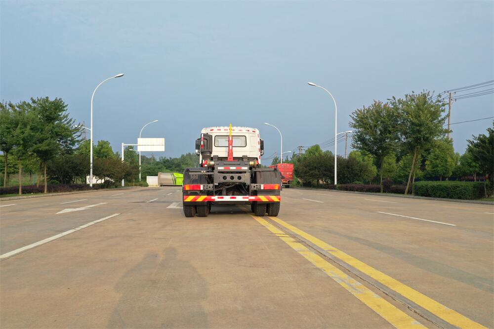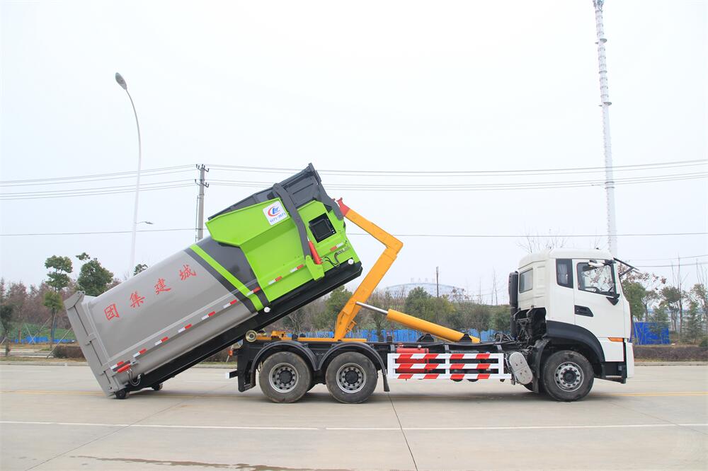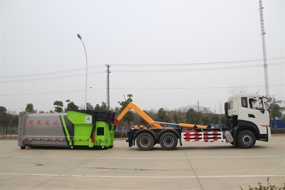 勾臂式垃圾車(車廂可卸式垃圾車)介紹: 車廂可卸式垃圾車又叫拉臂式垃圾車,是一種采用高新設計可伸縮的鉤臂,實現垃圾廂的二次吊裝,自吊上放下,可自行傾倒垃圾的環衛設備。 拉臂式垃圾車結構簡單,操作穩定方便,裝卸效率高,機械化程度高,節省人力。鉤臂垃圾車一車可帶多個垃圾廂,在裝卸的運輸過程中可有效地避免二次污染。 拉臂垃圾車采用高新設計可擺動的鉤臂,垃圾箱由框架、開啟油缸、滑輪、后門和若干加強框架與鋼板焊接而成。調換貨廂快捷方便,貨廂上帶蓋(倒垃圾時可翻開),鉤臂垃圾車垃圾廂體可選用碳鋼、不銹鋼材質、內部采取環氧樹脂防腐處理,改裝部分與原車底盤為可分離式,維修方便且保持了原車的機動性及行駛性能。