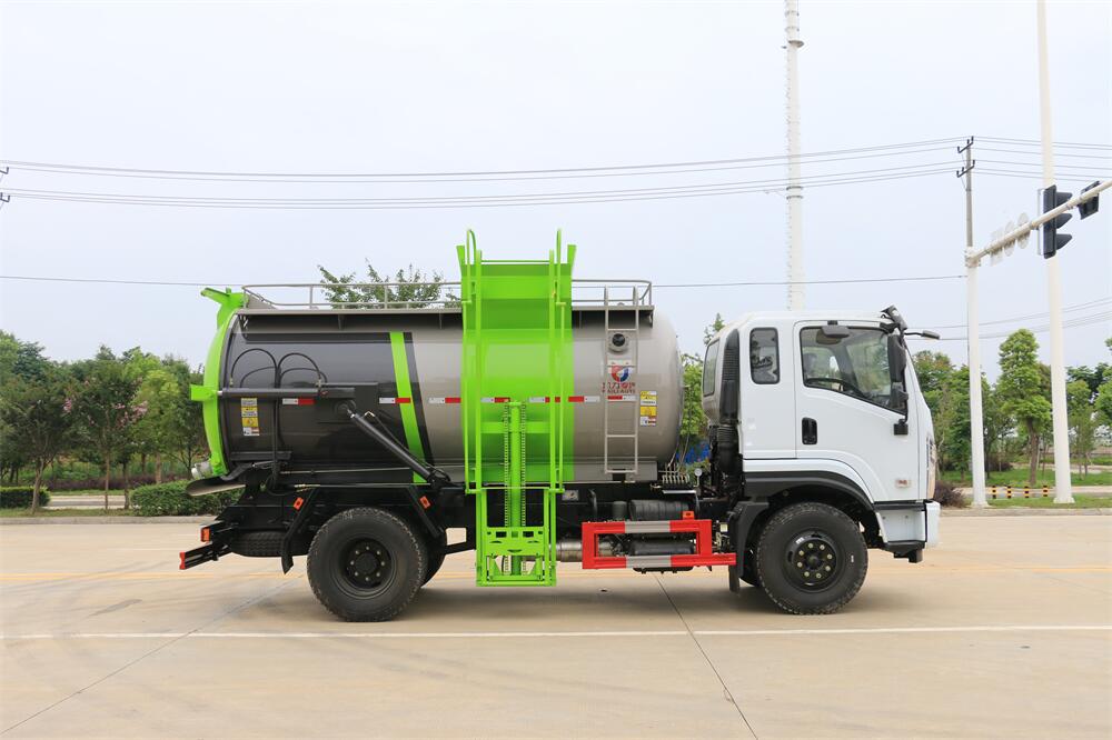 上裝配置:罐體容積10m3,配備120L/240L掛桶提升翻轉(zhuǎn)機(jī)構(gòu),液壓系統(tǒng),后蓋液壓鎖緊開(kāi)啟,罐體可以舉升自卸,尾部帶自流閥;用于運(yùn)輸液態(tài)垃圾,其特點(diǎn)操作簡(jiǎn)單,密封性好,無(wú)泄漏,無(wú)異味;可選裝固液分離功能,推板擠壓功能,常用于餐館的垃圾轉(zhuǎn)運(yùn)處理。