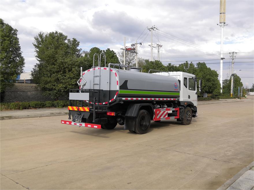 灑水車前裝有鴨形噴嘴或圓頭沖嘴,后面裝有圓柱開(kāi)灑水噴嘴或蓮蓬頭噴嘴,后部有一工作平臺(tái),裝配有水炮。后部還可裝8個(gè)噴嘴(選裝)。