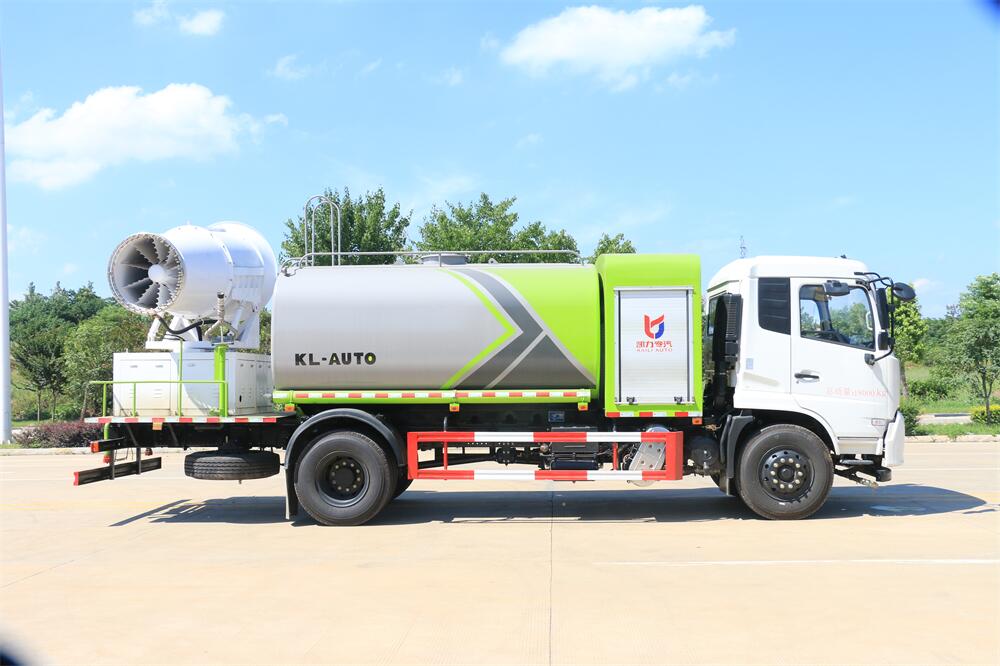 上裝配置:罐體容積為 12立方,選配風送式霧炮機組射程30米、40米、50米、60米、80米、100米、120米霧炮,罐體鋼板為4mm碳鋼Q235材質,罐內隔板具有防波作用,以減輕汽車行駛時罐體液體沖擊,罐體及整車外形尺寸按照公告。帶大功率專用灑水泵,泵可自吸自排,整車前沖、后灑、側噴、帶65消防接口,后平臺配CLW-50、CLW-60、CLW-80、CLW-100、CLW-120型風送式霧炮機組;罐體前封頭配大功率柴油發電機組;前封頭帶水位計,后平臺主管路帶1寸澆花接口,后爬梯。帶兩根輸水管及陰陽端。罐體顏色:銀/灰/綠,罐體兩側噴“多功能抑塵車”字樣,貼反光標示。