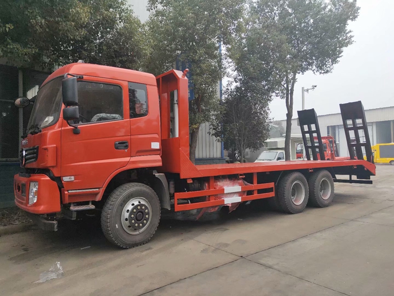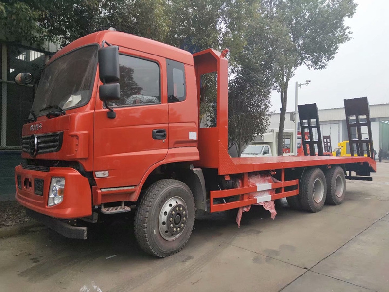 東風商用后八輪平板車,玉柴270馬力,陜齒10檔,153后橋,軸距4350+1300,1000鋼絲胎,整車長10.550米寬2.55米高3.06米。可以拉28噸以下挖機